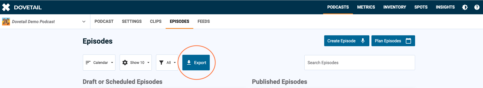 In the Episodes tab of your podcast, you’ll see the Export button: