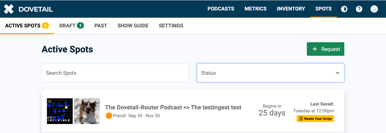 Dovetail Spots is an application that allows users to request, approve, and set up promotional advertising swaps (aka - “cross-promos”) with other Dovetail shows to help grow your audience. You’re able to select from existing Dovetail users who can then accept or reject your request.