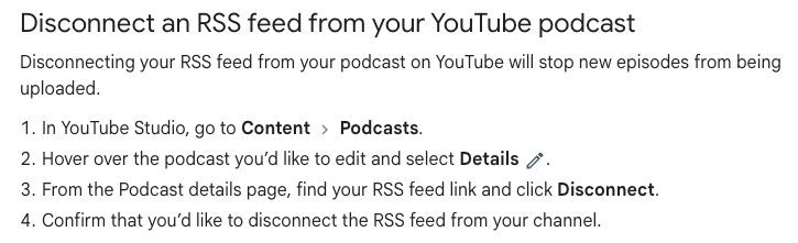 Once disconnected, reconnect your RSS Feed to YouTube to pull in the latest episode and all future published episode content.