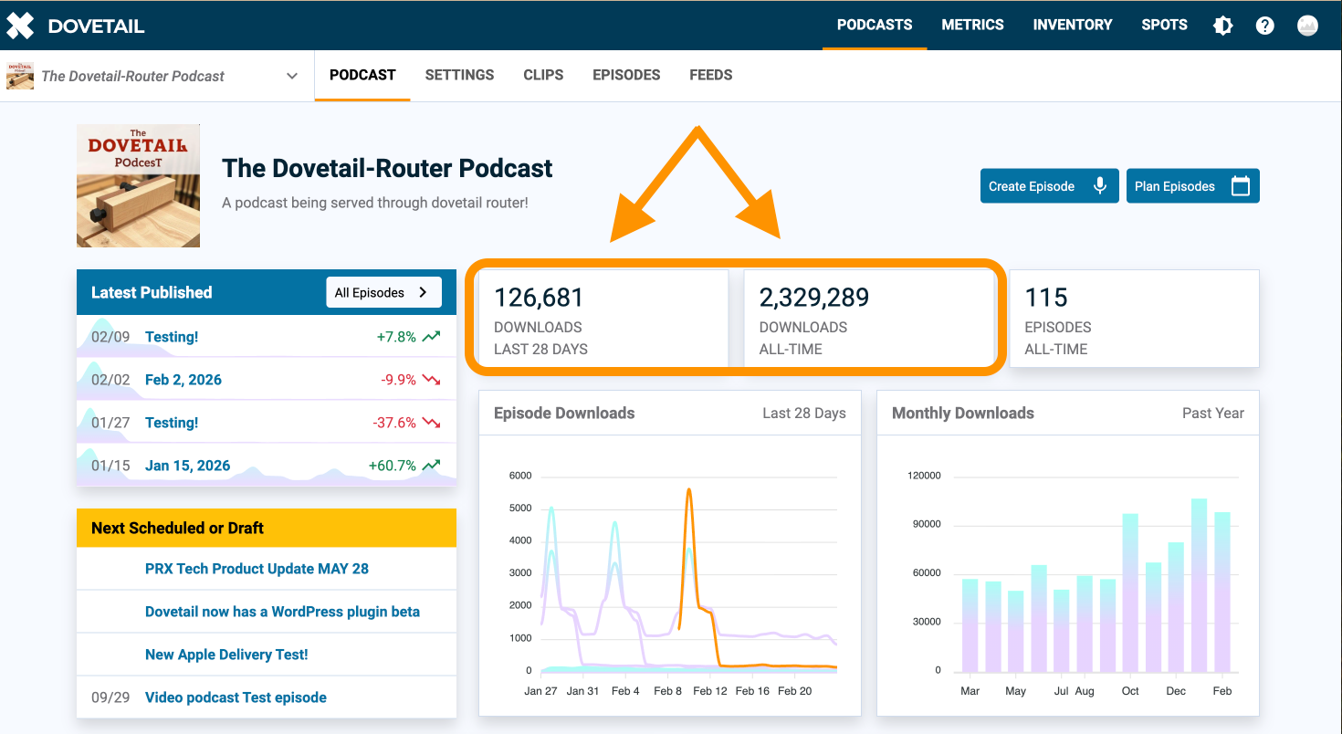 - Multiple quick-views for downloads metrics organized by episode, season, sub-feed, geographic location, and more!